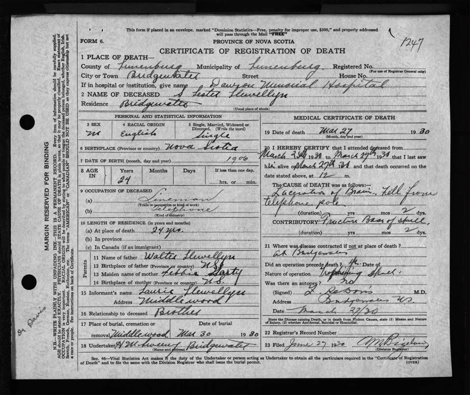 Male Death Registration: Year: 1930 file: 127 number: 1247