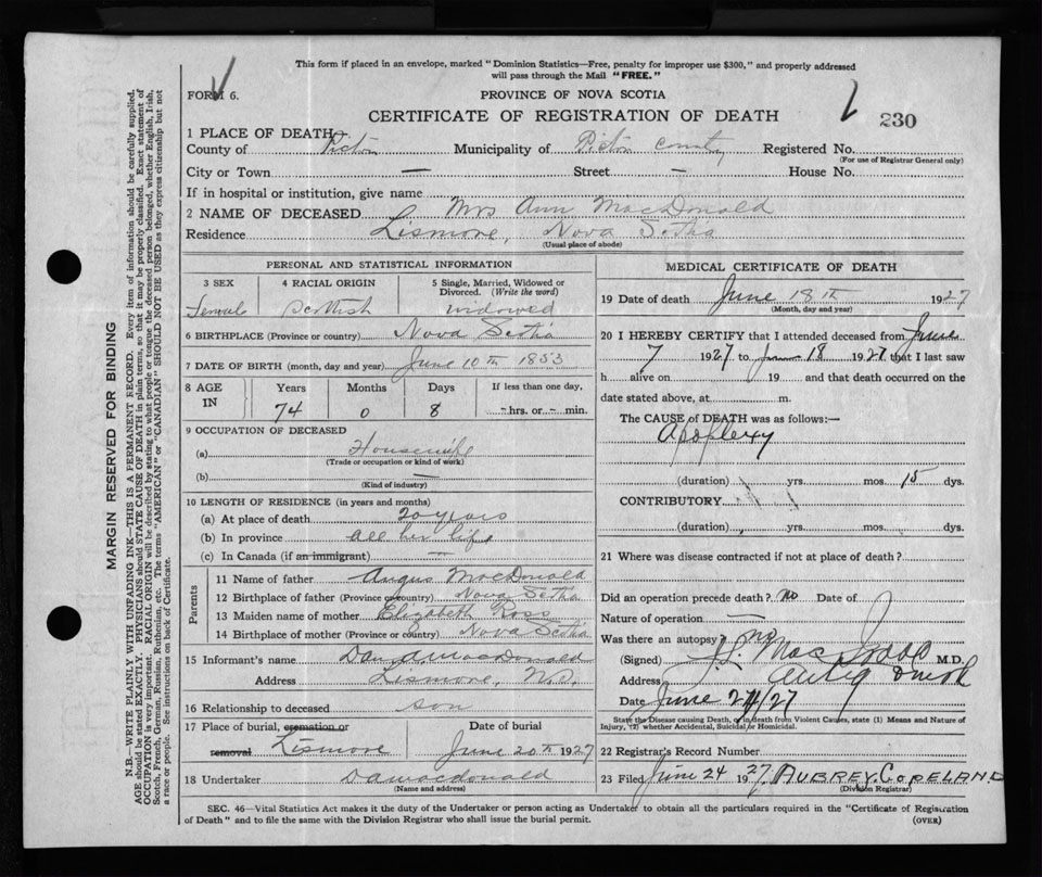 Nova Scotia Archives — https://archives.novascotia.ca/vital-statistics/death/?ID=236461