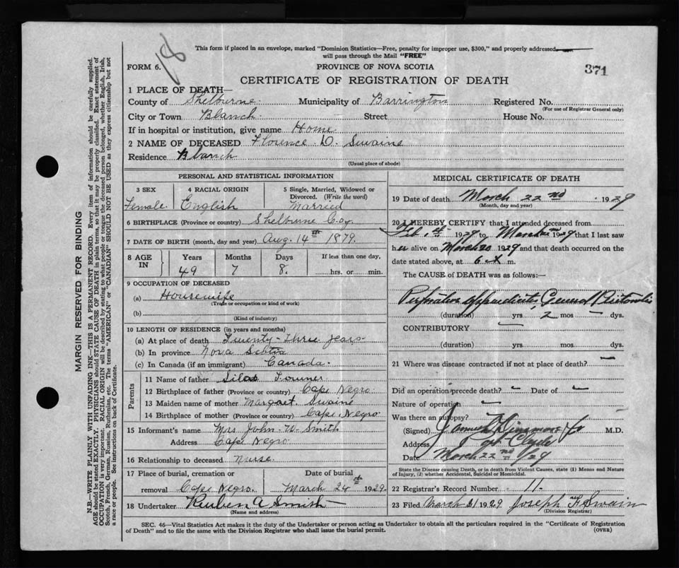 Female Death Registration: Year: 1929 file: 131 number: 371