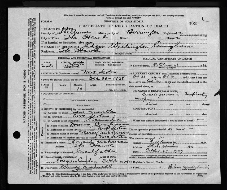 Male Death Registration: Year: 1929 file: 131 number: 463