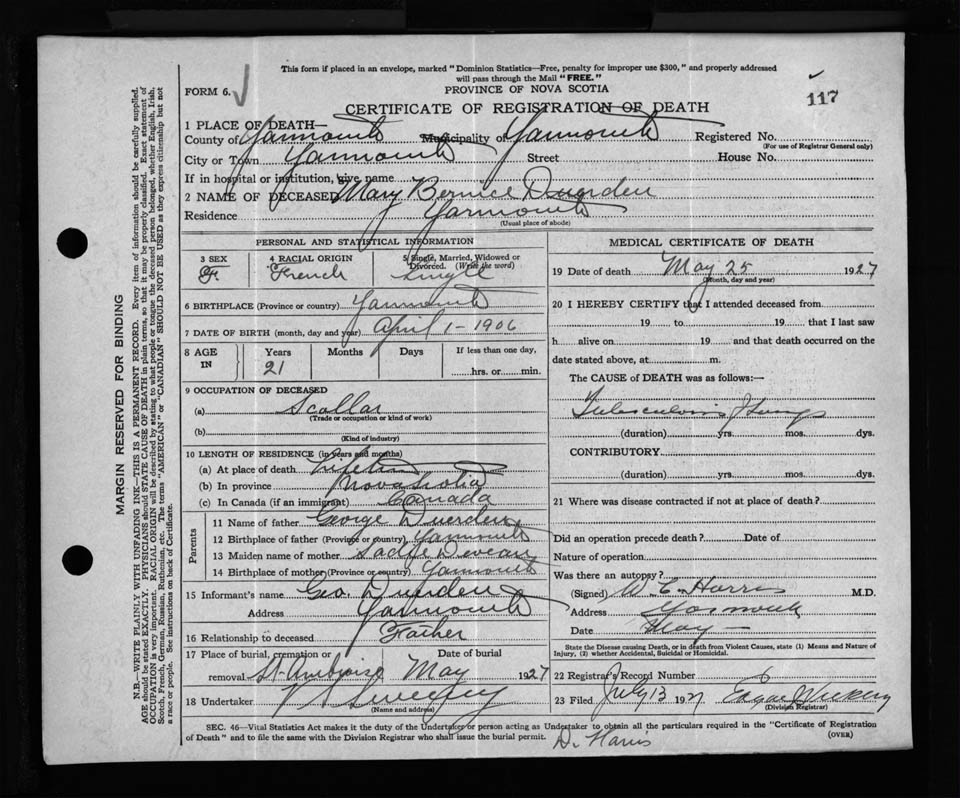 Female Death Registration: Year: 1927 file: 133 number: 117