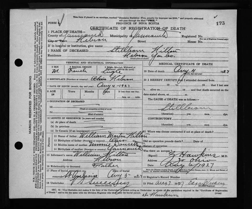 Male Death Registration: Year: 1927 file: 133 number: 173