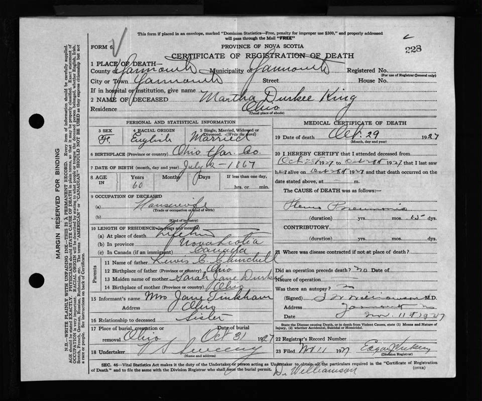 Female Death Registration: Year: 1927 file: 133 number: 228