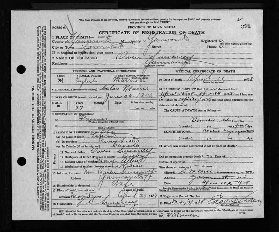 Male Death Registration: Year: 1928 file: 133 number: 371