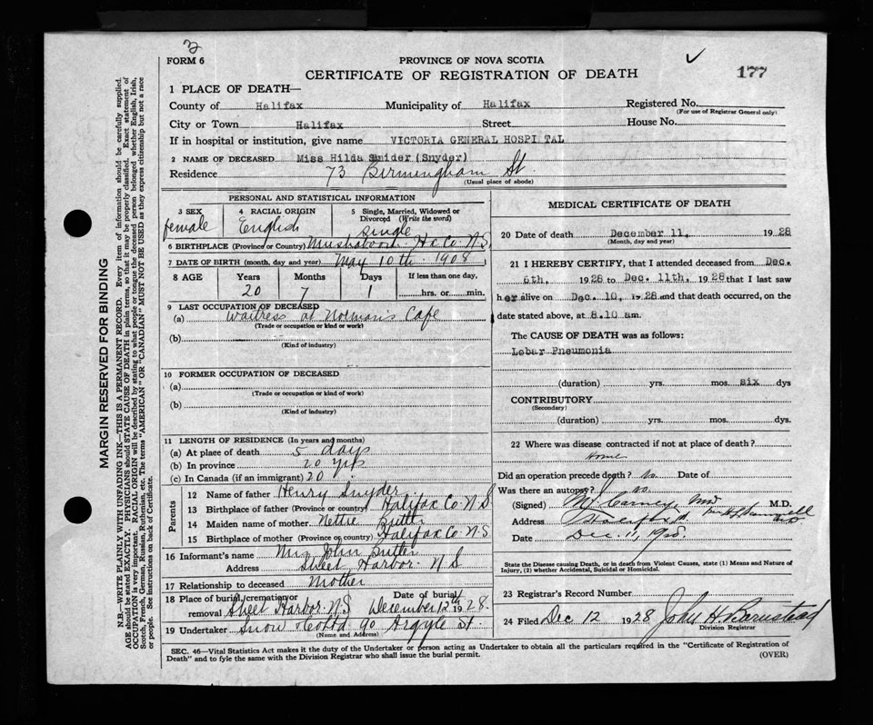 Female Death Registration: Year: 1928 file: 134 number: 177