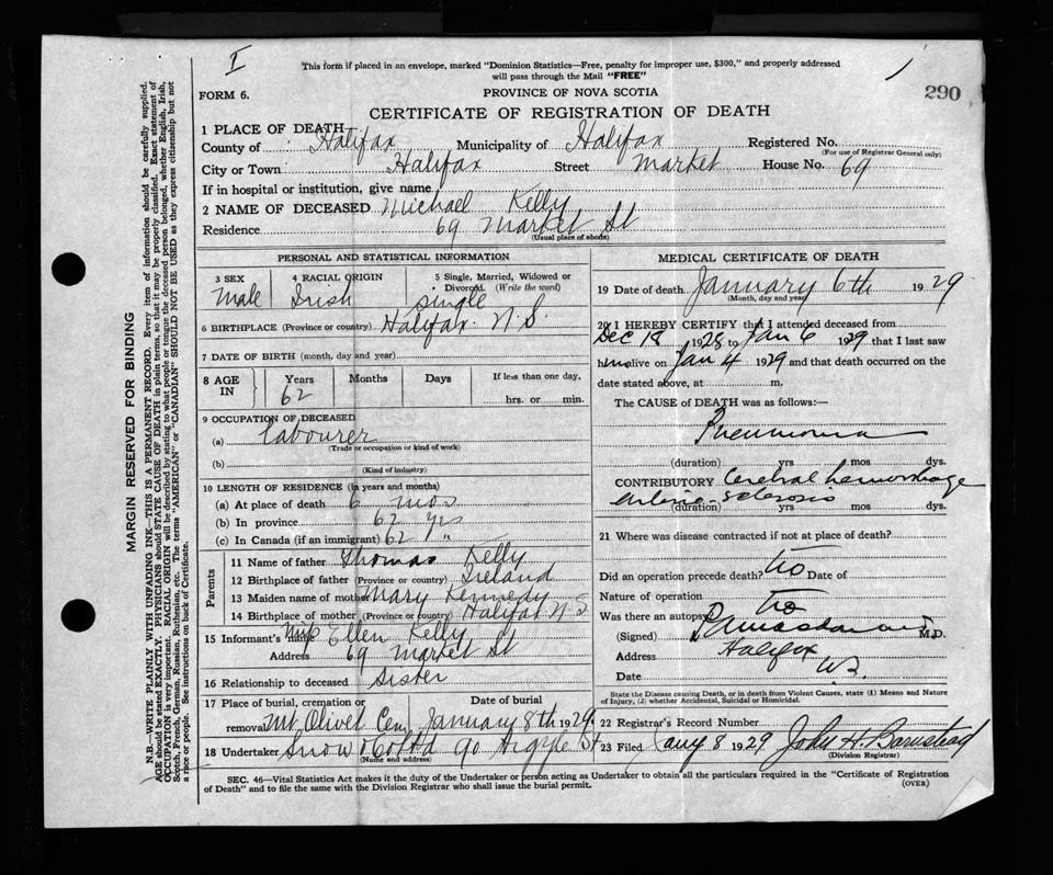Male Death Registration: Year: 1929 file: 134 number: 290