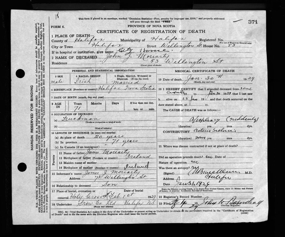 Male Death Registration: Year: 1929 file: 134 number: 371