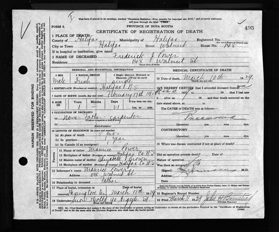 Male Death Registration: Year: 1929 file: 134 number: 493