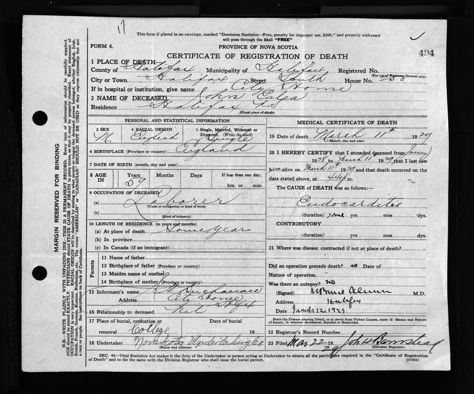 Male Death Registration: Year: 1929 file: 134 number: 494