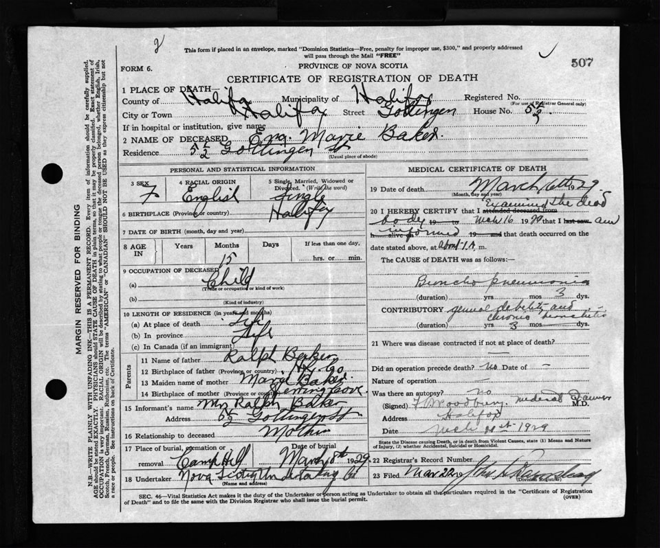Female Death Registration: Year: 1929 file: 134 number: 507