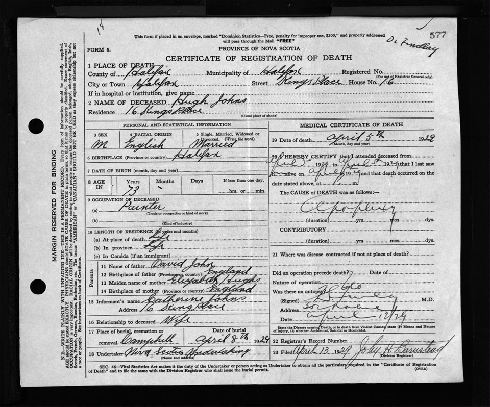 Male Death Registration: Year: 1929 file: 134 number: 577
