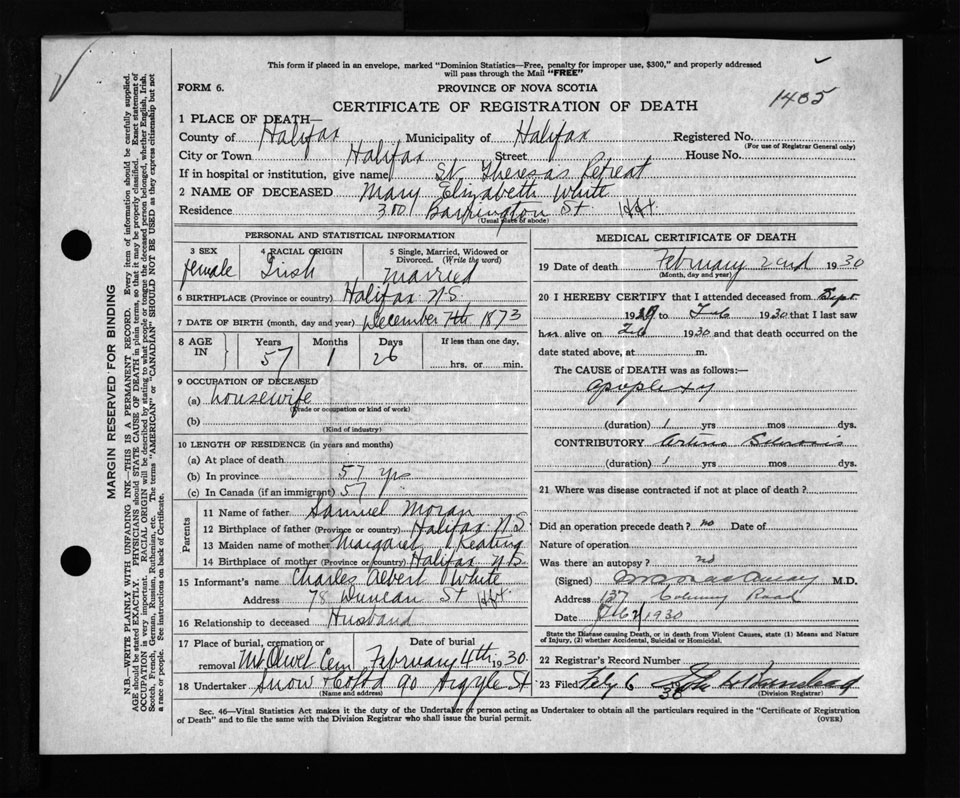 Female Death Registration: Year: 1930 file: 134 number: 1405