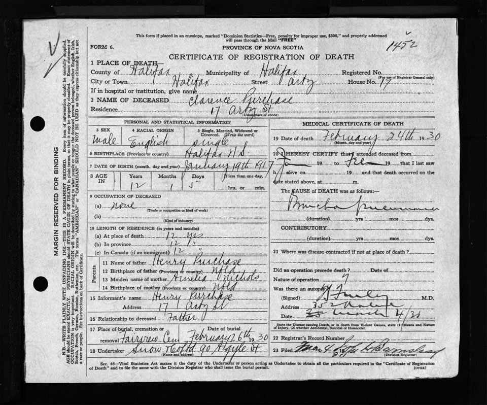 Male Death Registration: Year: 1930 file: 134 number: 1452