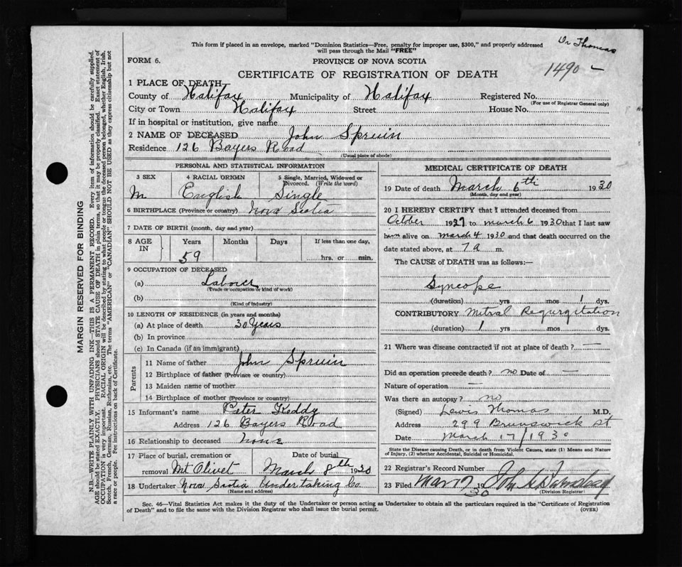 Male Death Registration: Year: 1930 file: 134 number: 1490