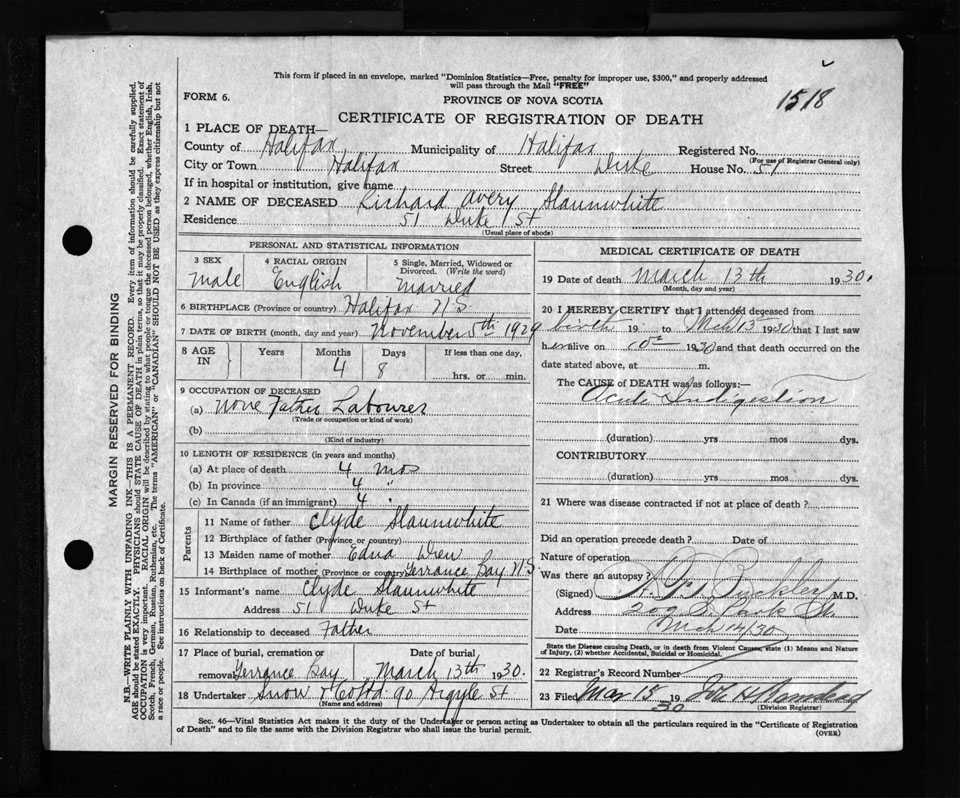 Male Death Registration: Year: 1930 file: 134 number: 1518
