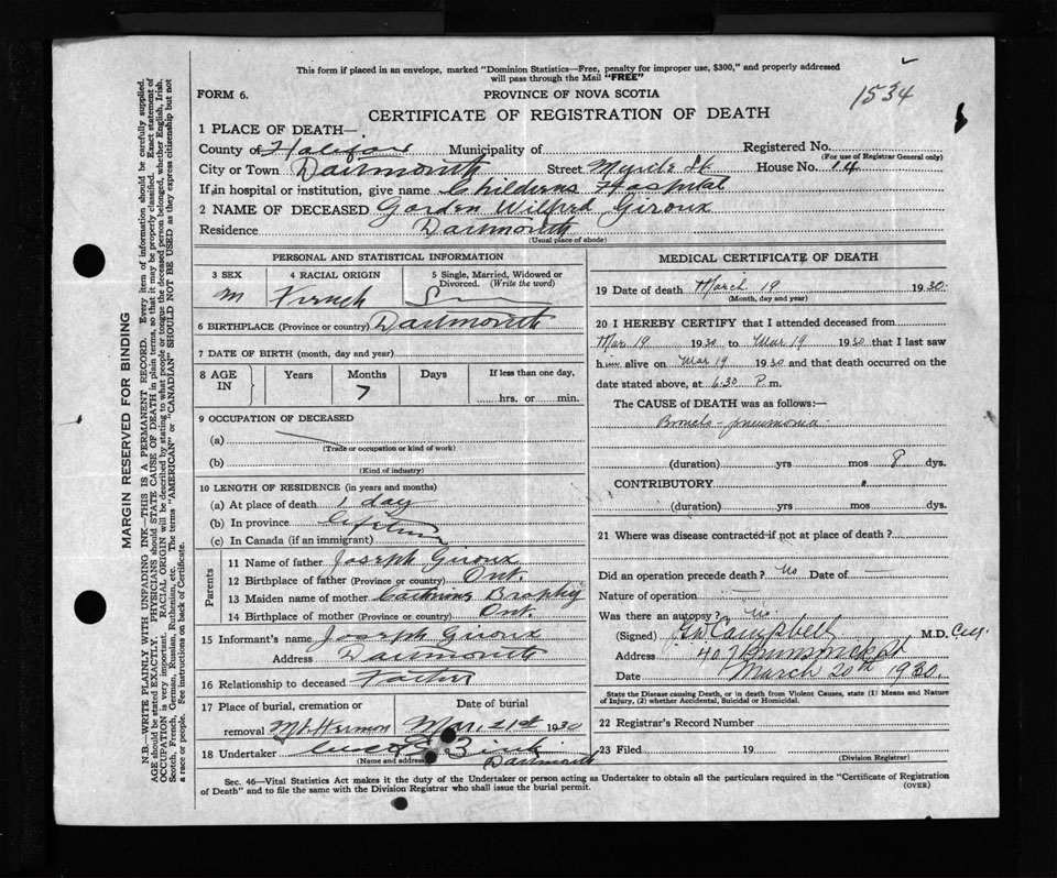Male Death Registration: Year: 1930 file: 134 number: 1534