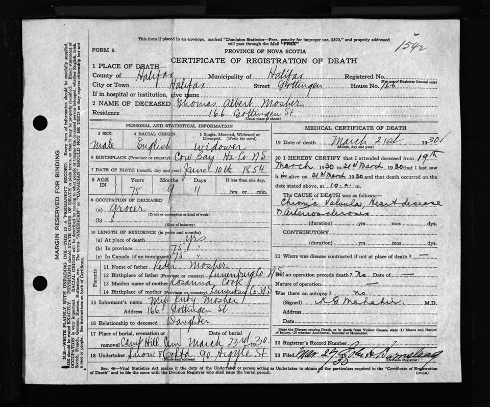 Male Death Registration: Year: 1930 file: 134 number: 1542