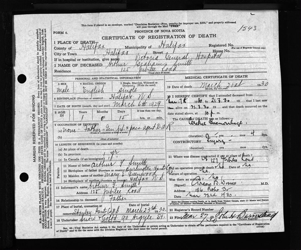 Male Death Registration: Year: 1930 file: 134 number: 1543