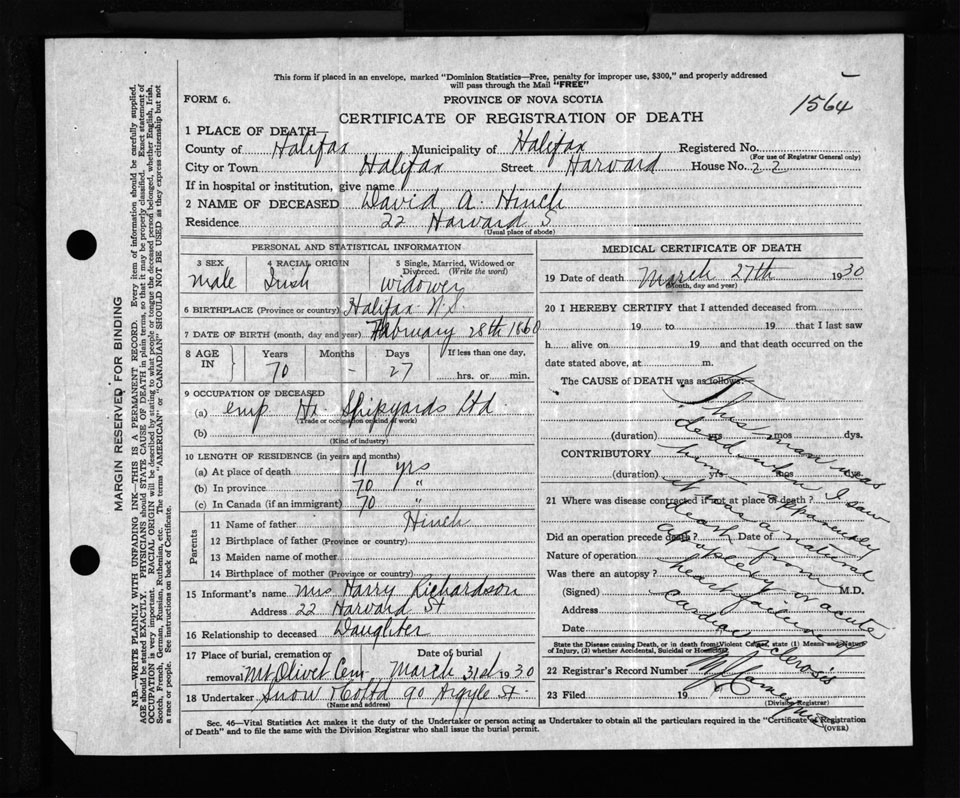 Male Death Registration: Year: 1930 file: 134 number: 1564