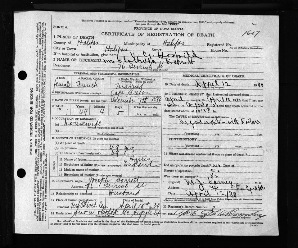 Female Death Registration: Year: 1930 file: 134 number: 1607