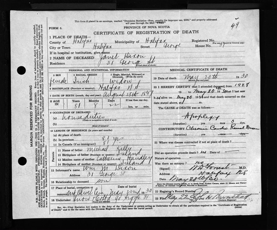 Female Death Registration: Year: 1930 file: 135 number: 49