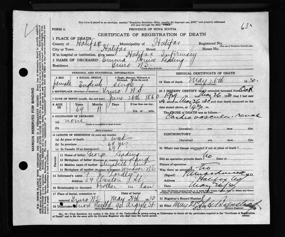 Female Death Registration: Year: 1930 file: 135 number: 63