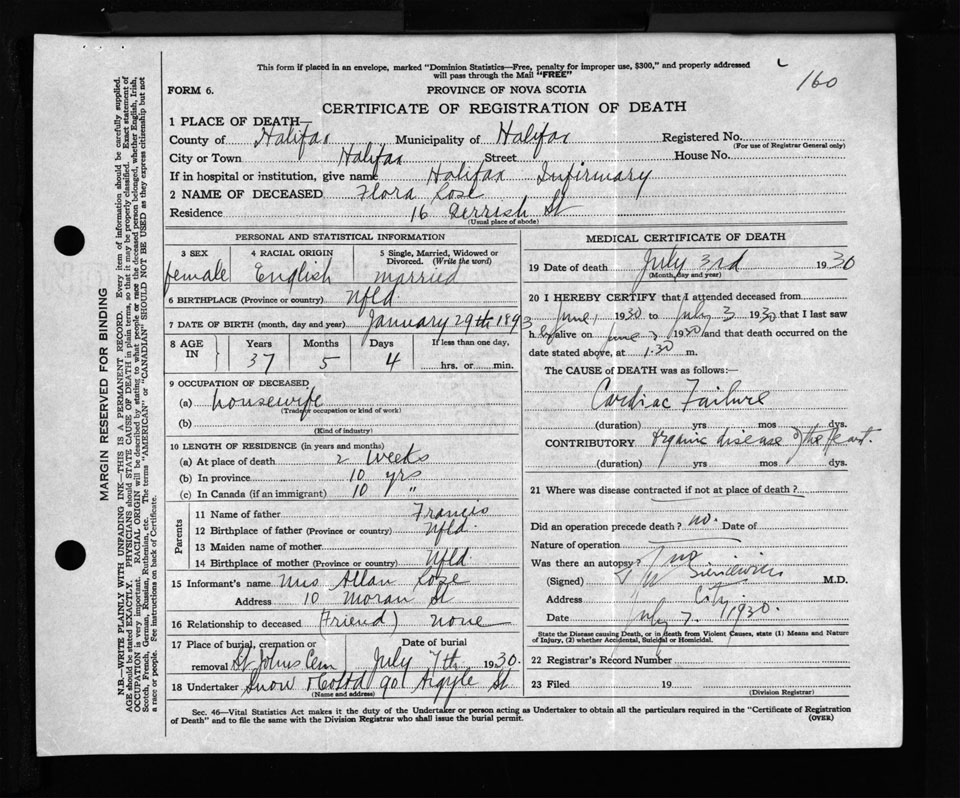 Female Death Registration: Year: 1930 file: 135 number: 160