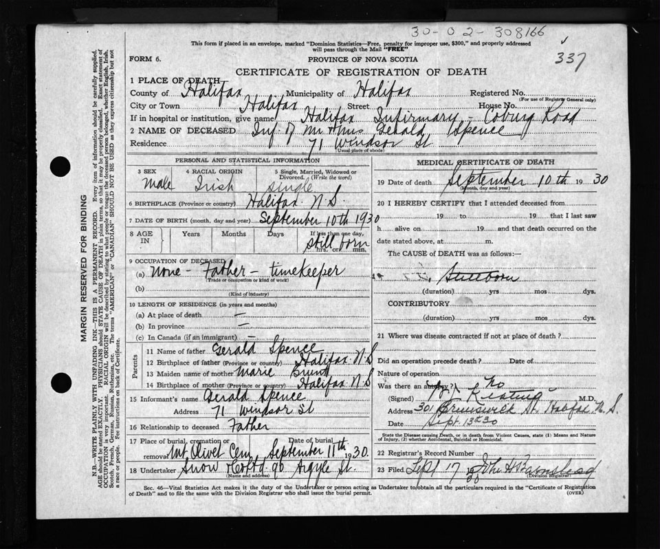 Male Death Registration: Year: 1930 file: 135 number: 337