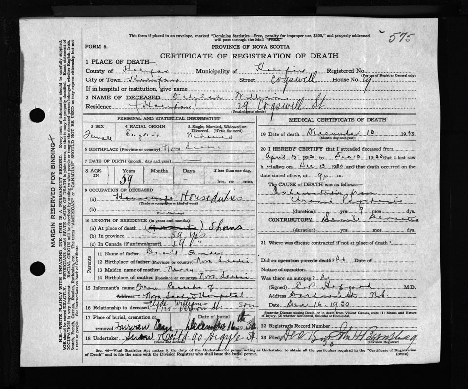 Female Death Registration: Year: 1930 file: 135 number: 575