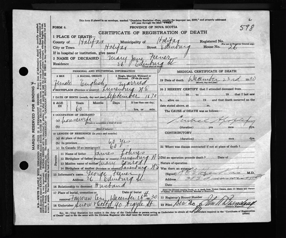 Female Death Registration: Year: 1930 file: 135 number: 598