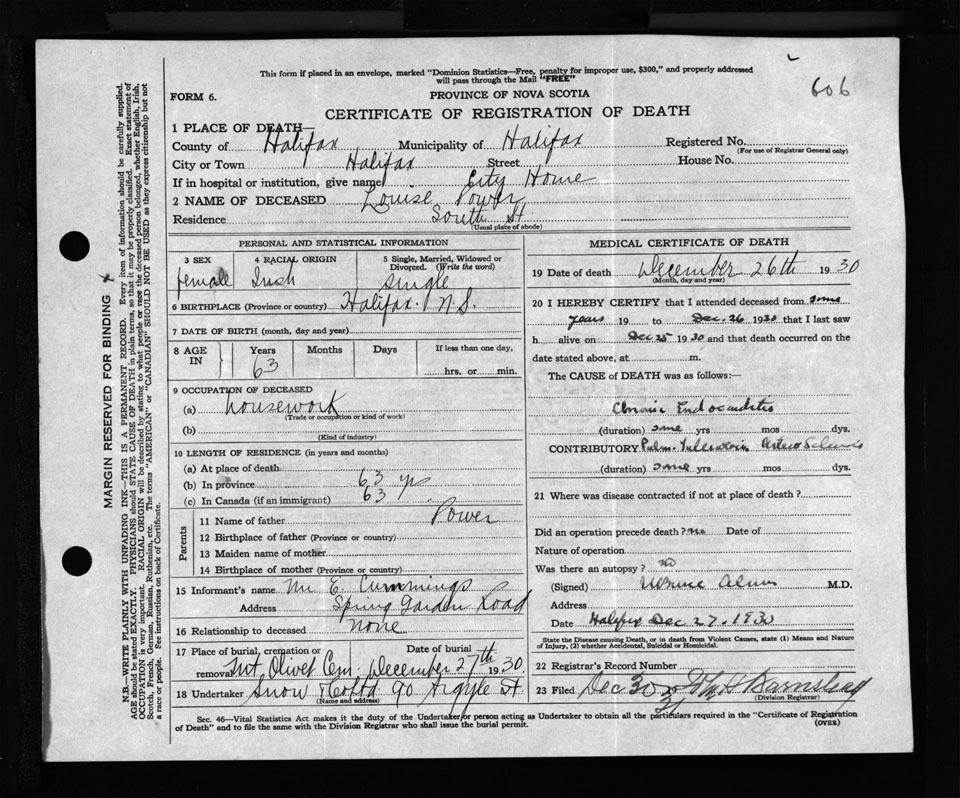 Female Death Registration: Year: 1930 file: 135 number: 606