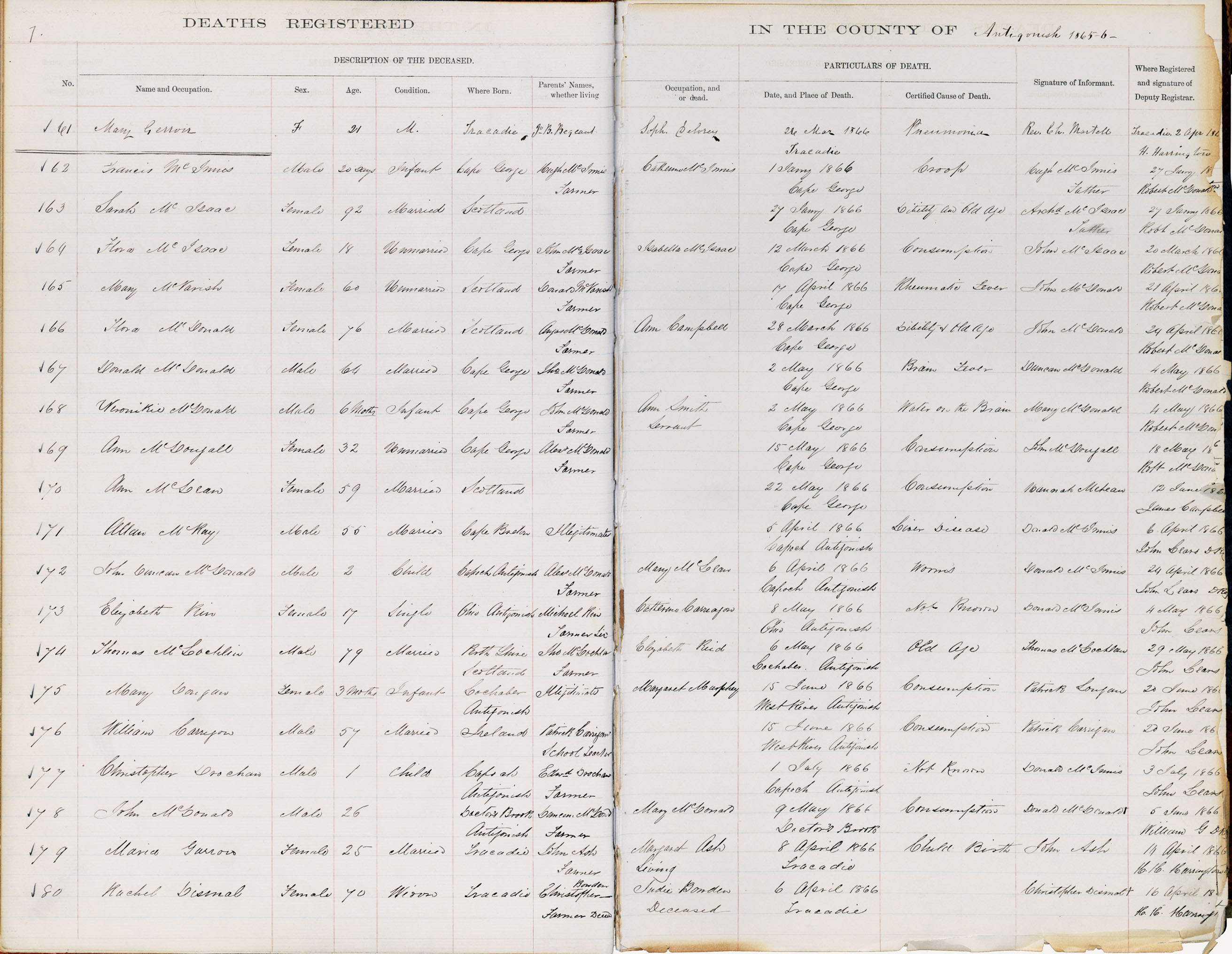 Death Registration: Year: 1866 book: 1802 page: 7 number: 80