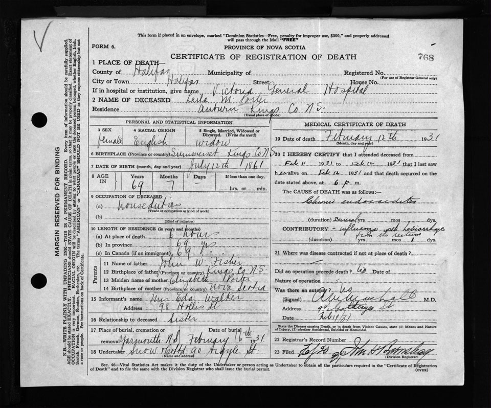 Female Death Registration: Year: 1931 file: 135 number: 768
