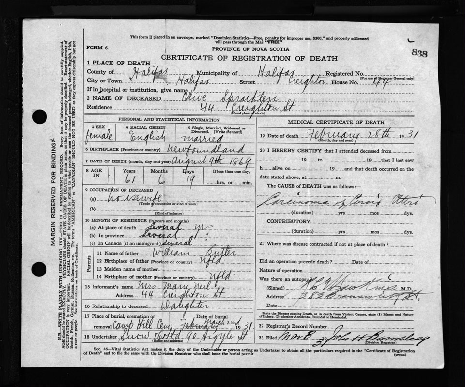 Female Death Registration: Year: 1931 file: 135 number: 838