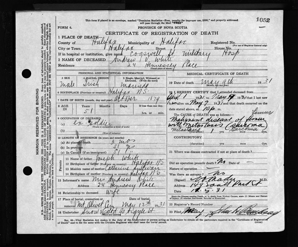Male Death Registration: Year: 1931 file: 135 number: 1052