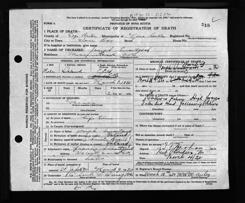 Male Death Registration: Year: 1930 file: 140 number: 215