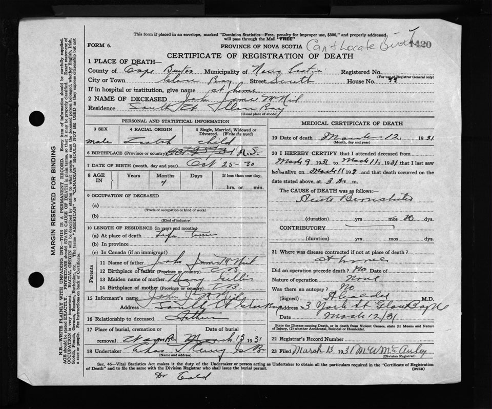 Male Death Registration: Year: 1931 file: 140 number: 1420