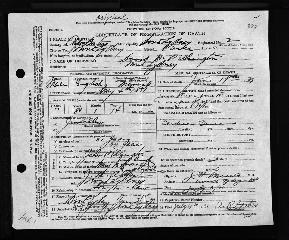 Male Death Registration: Year: 1931 file: 141 number: 177