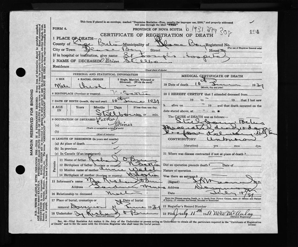 Male Death Registration: Year: 1931 file: 141 number: 194