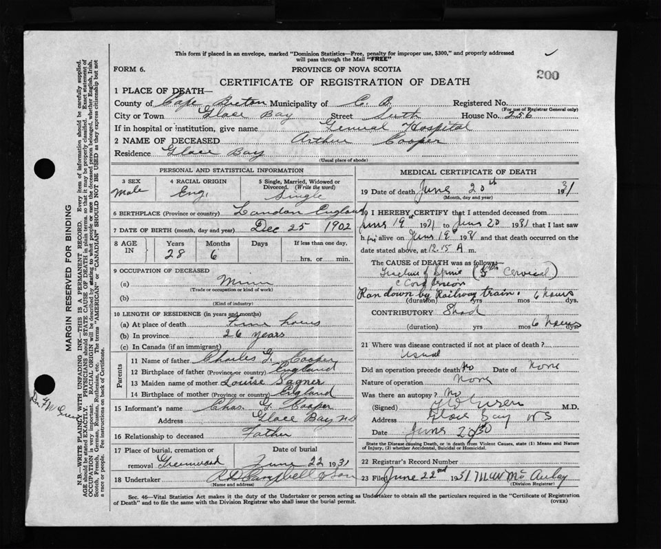 Male Death Registration: Year: 1931 file: 141 number: 200