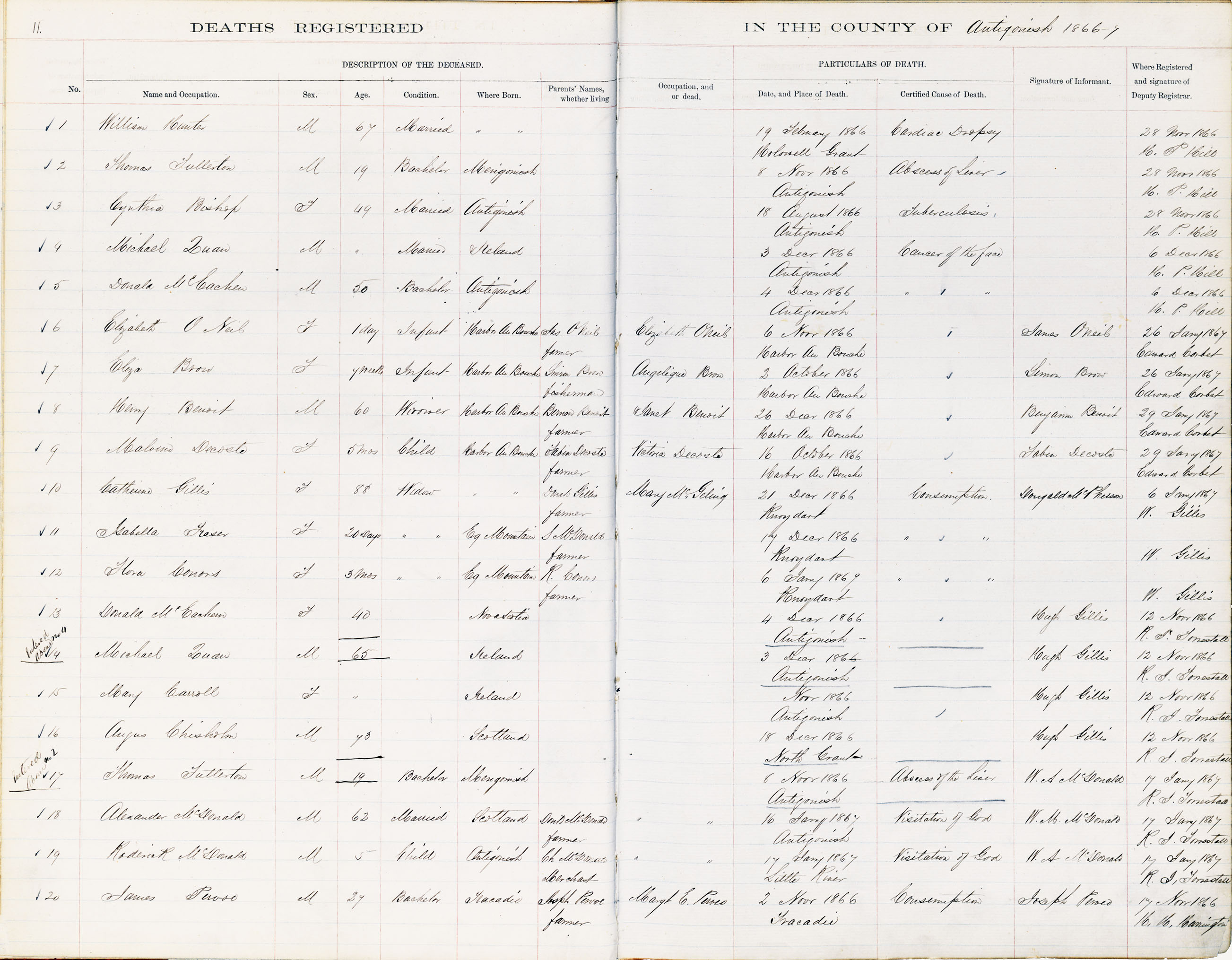 Death Registration: Year: 1866 book: 1802 page: 11 number: 20