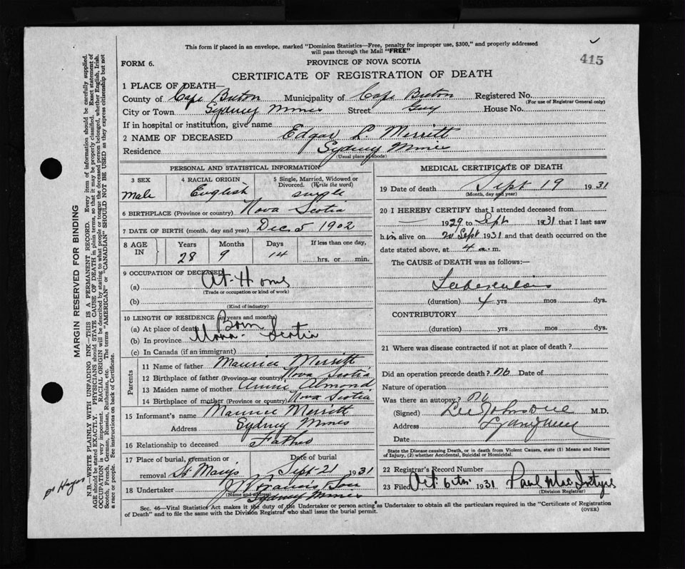 Male Death Registration: Year: 1931 file: 141 number: 415