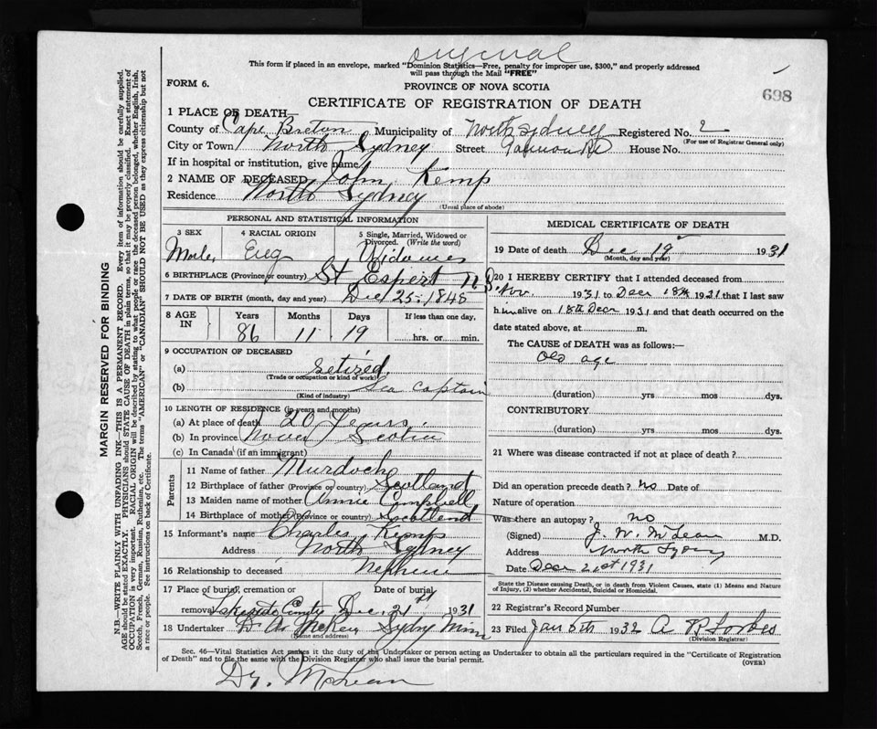 Male Death Registration: Year: 1931 file: 141 number: 698