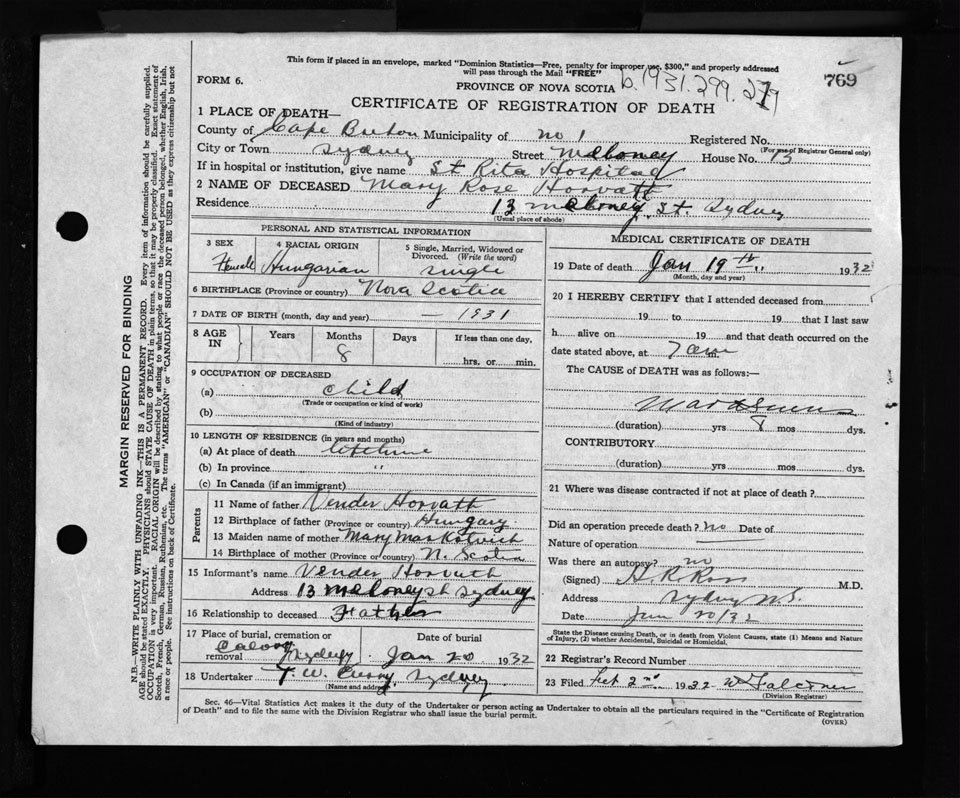 Female Death Registration: Year: 1932 file: 141 number: 769