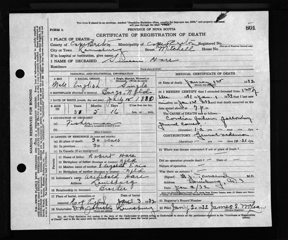 Male Death Registration: Year: 1932 file: 141 number: 801