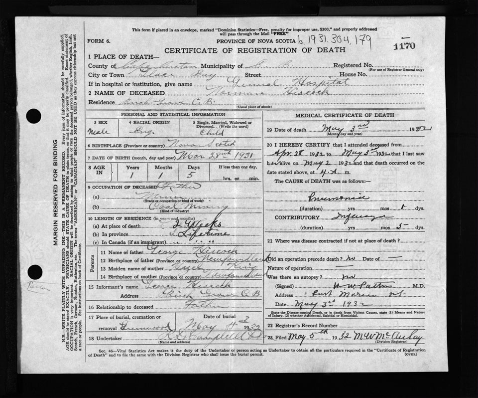 Male Death Registration: Year: 1932 file: 141 number: 1170