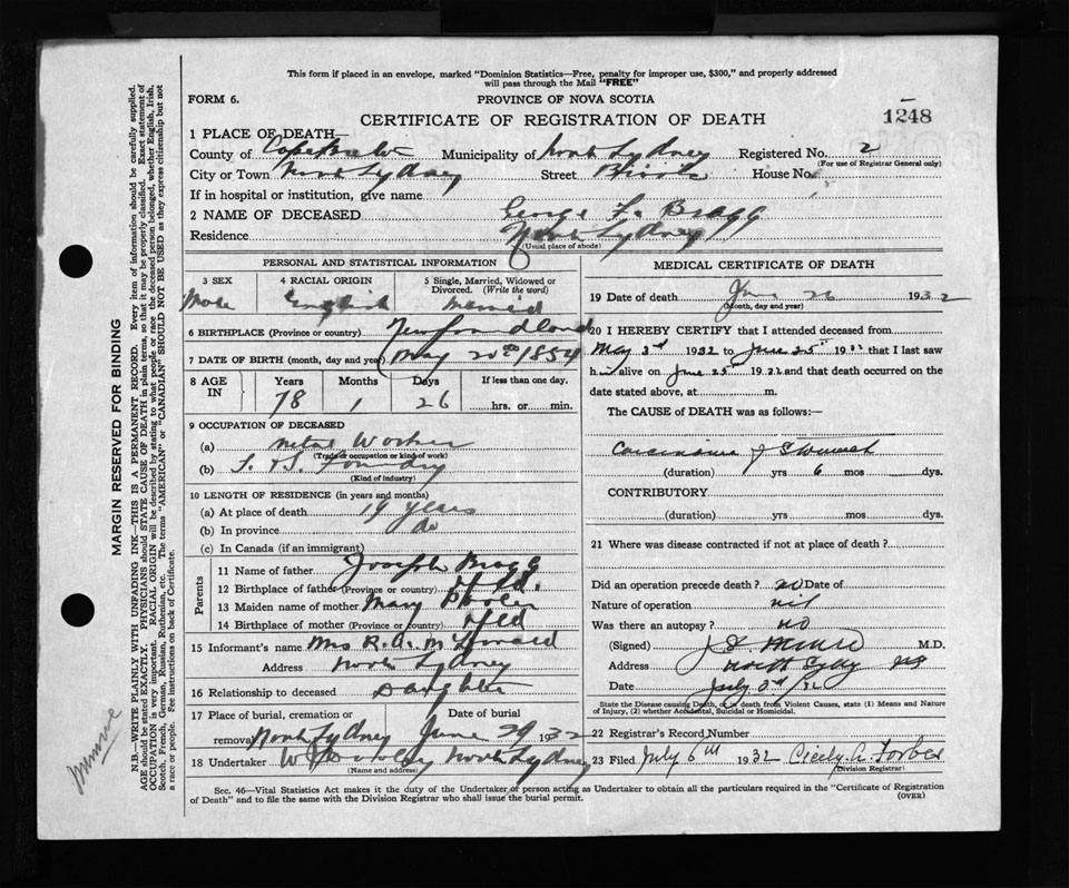 Male Death Registration: Year: 1932 file: 141 number: 1248