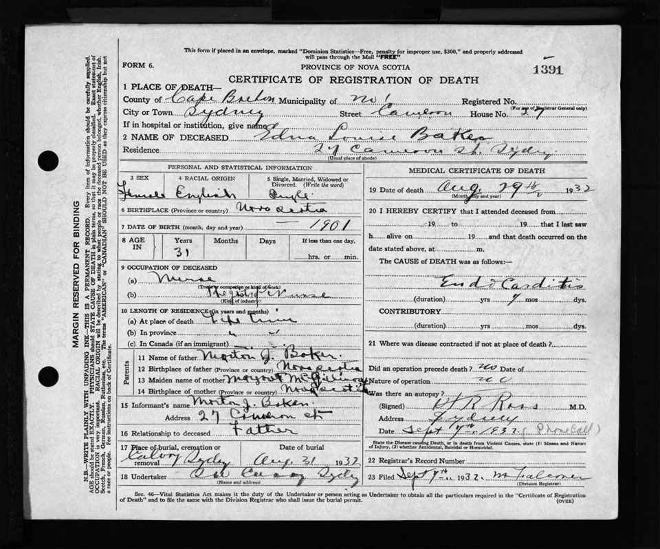 Female Death Registration: Year: 1932 file: 141 number: 1391