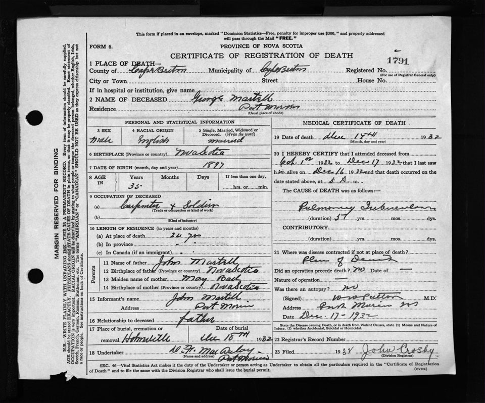Male Death Registration: Year: 1932 file: 141 number: 1791