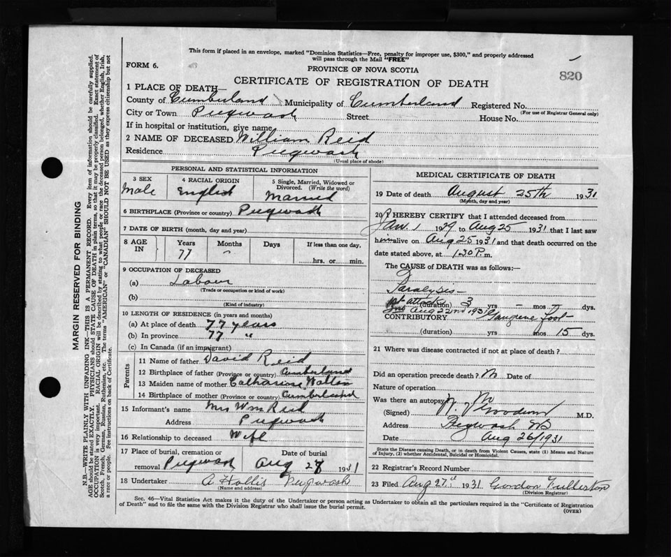 Male Death Registration: Year: 1931 file: 143 number: 820